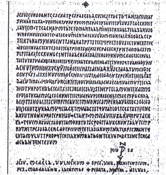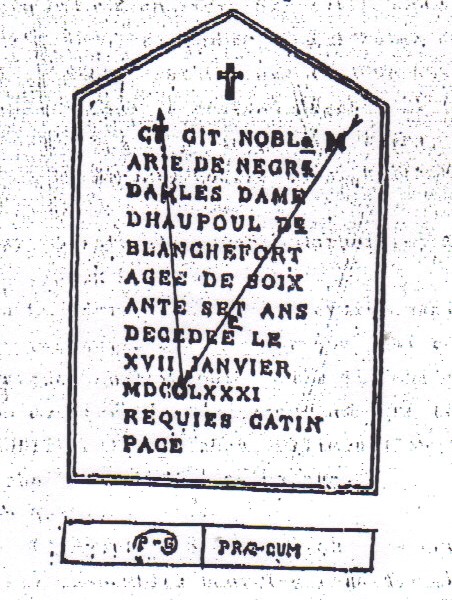 CHARLOT – Voilà, il est enfoncé dans la boue et nous devons l’en sortir. Il creuse la terre sur le coté gauche de la tombe, près de la vieille pierre fleurie. Il découvre une drôle de plaque en cuivre recouverte de vert de gris, profondément gravé s’y trouve une grille. Elle donne le circuit du saut du cavalier. Après sévère nettoyage dans le cours d’eau de la Sals qui coule proche, CHARLOT l’applique au texte du double échiquier précédement énoncé et on peut lire :